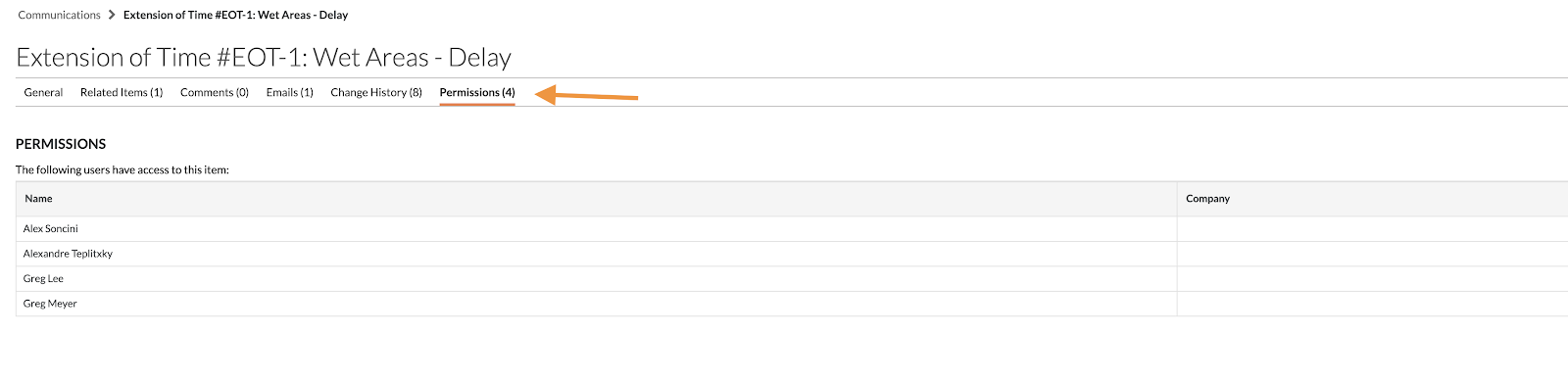 You can navigate to the Permissions tab for each individual correspondence item in a project. Every user who has access to this particular correspondence will be listed.