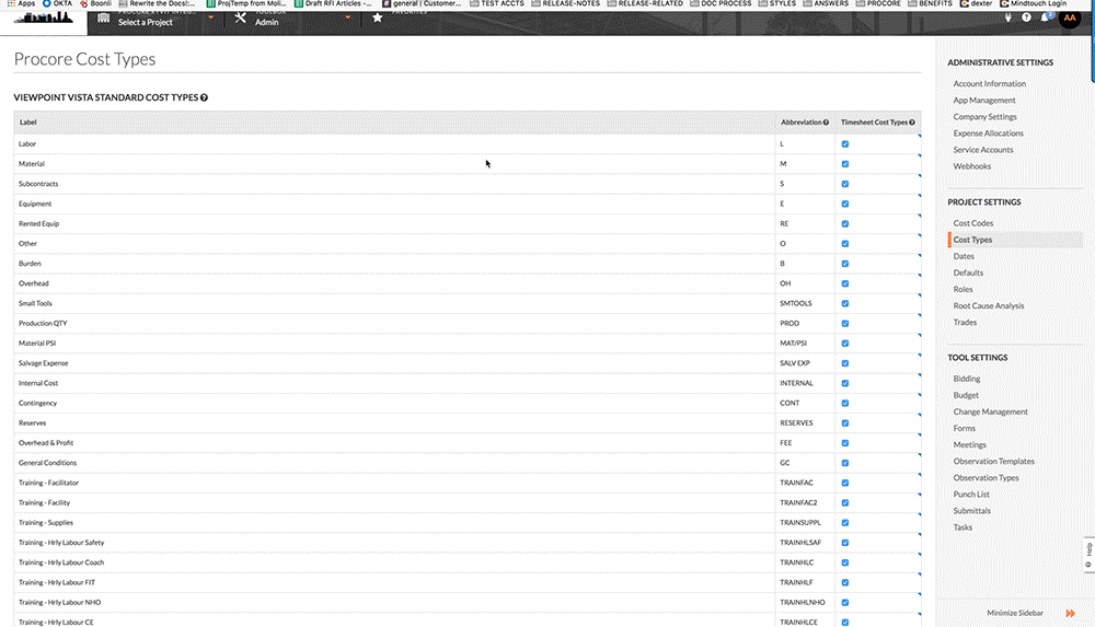 When your company account is configured to use the Viewpoint® Spectrum® Connector, your Viewpoint® Spectrum® system's cost types and their corresponding abbreviations are imported into Procore's Company and Project level Admin tools from your Viewpoint® Spectrum® project(s). They appear in the Company level Admin tool, under Project Settings, on the Cost Types page). Any modifications the 'Viewpoint® Spectrum® Standard Cost Types' list must always made in the integrated Viewpoint® Spectrum® project.
