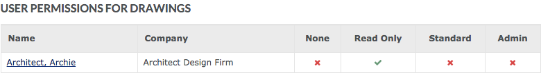 indicates the permission level assigned to the user. For example, in the screenshot below, the user has 'Standard' permissions on the Drawings tool.
